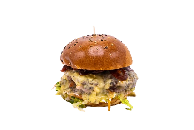 Bulka grilovaná na másle. Mleté hovězí (100g), hermelín (120g), slanina, čedar, sýr montana, rajčátka, salát, cibule, omáčky (bbq, medová majonéza a hořčičný dip).