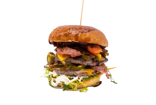 Bulka grilovaná na másle, mleté hovězí (100g), lehce pikantní trhané vepřové, omáčka z habanero papriček, slanina, čedar, sýr montana, rajčátka, salát, cibule, omáčky (bbq, medová majonéza a hořčičný dip).
