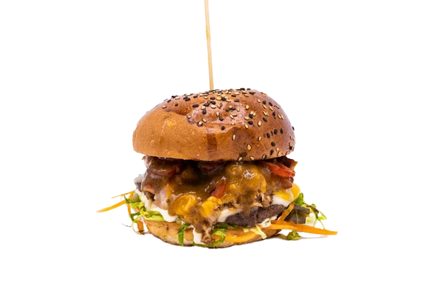 Bulka grilovaná na másle, mleté hovězí (100g), lehce pikantní trhané vepřové, omáčka z habanero papriček, slanina, čedar, sýr montana, rajčátka, salát, cibule, omáčky (bbq, medová majonéza a hořčičný dip).
