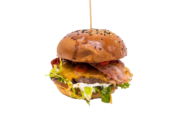 Bulka grilovaná na másle, 2x mleté hovězí maso (100g), 2x slanina, 2x čedar, rajče, cibule, salát, omáčky (bbq, medová majonéza a hořčičný dip).