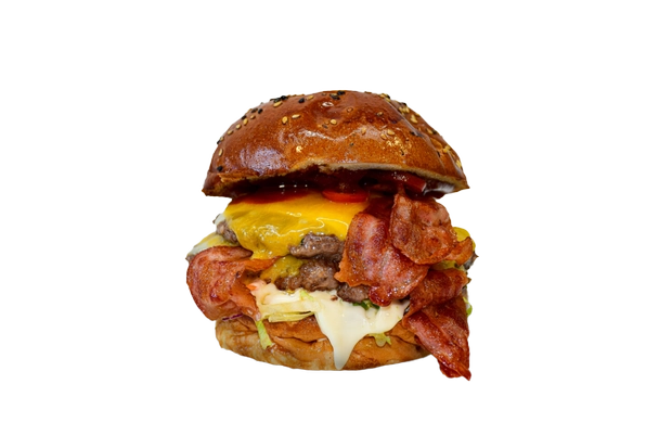 Bulka grilovaná na másle, 2x mleté hovězí maso (100g), 2x slanina, 2x čedar, rajče, cibule, salát, omáčky (bbq, medová majonéza a hořčičný dip).