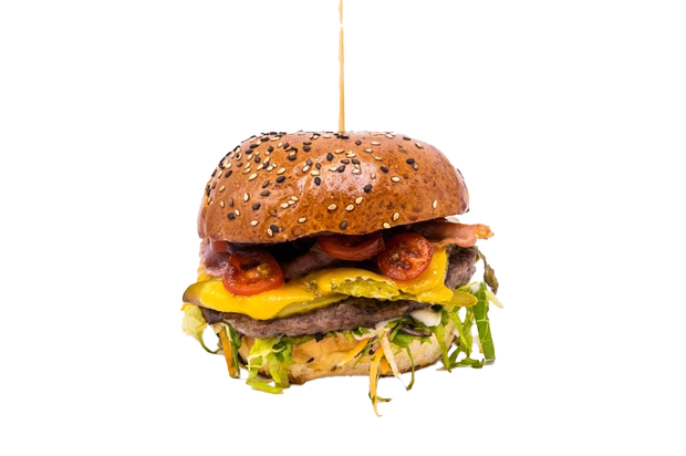 Bulka grilovaná na másle, 2x mleté hovězí maso (100g), 2x slanina, 2x čedar, rajče, cibule, salát, omáčky (bbq, medová majonéza a hořčičný dip).