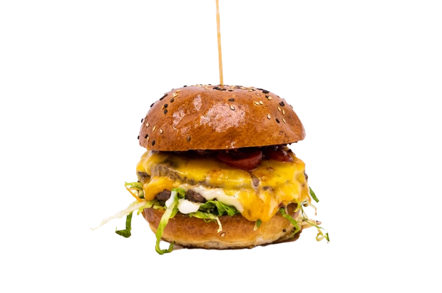 Bulka grilovaná na másle. Mleté hovězí (100g), hermelín (120g), slanina, čedar, sýr montana, rajčátka, salát, cibule, omáčky (bbq, medová majonéza a hořčičný dip).
