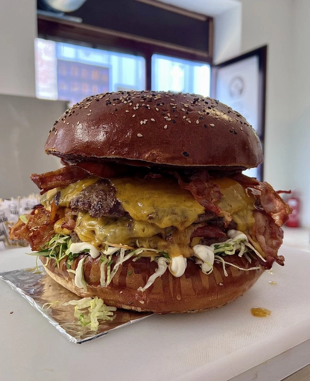 Bulka grilovaná na másle. Mleté hovězí (100g), hermelín (120g), slanina, čedar, sýr montana, rajčátka, salát, cibule, omáčky (bbq, medová majonéza a hořčičný dip).