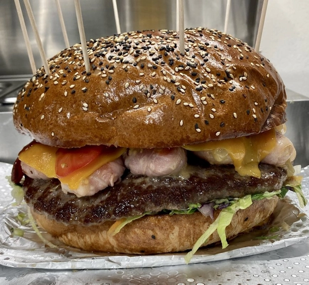 Bulka grilovaná na másle, mleté hovězí (100g), lehce pikantní trhané vepřové, omáčka z habanero papriček, slanina, čedar, sýr montana, rajčátka, salát, cibule, omáčky (bbq, medová majonéza a hořčičný dip).