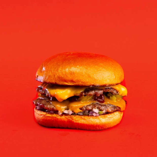 Bulka grilovaná na másle, mleté hovězí (100g), lehce pikantní trhané vepřové, omáčka z habanero papriček, slanina, čedar, sýr montana, rajčátka, salát, cibule, omáčky (bbq, medová majonéza a hořčičný dip).