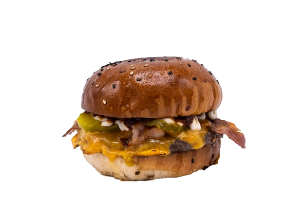 Bulka grilovaná na másle, mleté hovězí (100g), lehce pikantní trhané vepřové, omáčka z habanero papriček, slanina, čedar, sýr montana, rajčátka, salát, cibule, omáčky (bbq, medová majonéza a hořčičný dip).