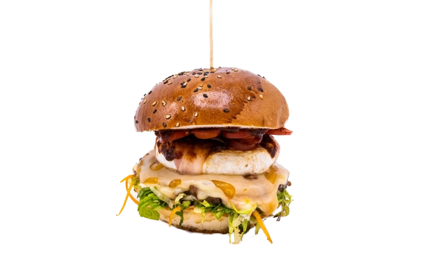 Bulka grilovaná na másle. Mleté hovězí (100g), hermelín (120g), slanina, čedar, sýr montana, rajčátka, salát, cibule, omáčky (bbq, medová majonéza a hořčičný dip).