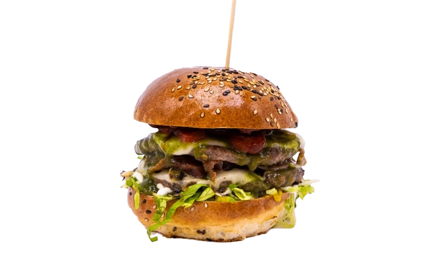 Bulka grilovaná na másle. Pasta ze zelených papriček. 2x hovězí maso (100g), slanina, sýr montana, rajčátka, salát, cibule, omáčky (bbq, medová majonéza a hořčičný dip).